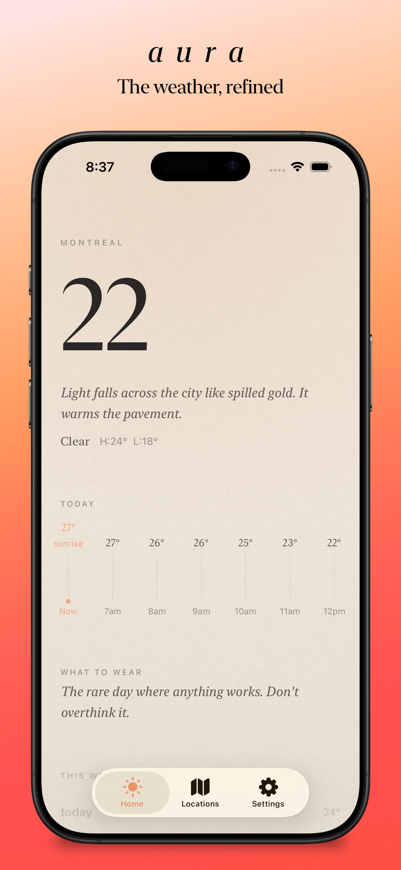Aura doesn't just tell you the temperature. It understands wind chill and humidity to give you precise clothing advice.